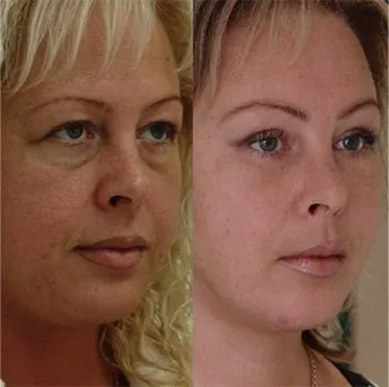 Stratul de grăsime subcutanată deformează vizibil contururile, schimbând ovalul feței. Mușchii cad, pielea devine flasc. Există pliuri nazolabiale pronunțate, obrajii „buldog“, bărbie dublă, pleoape căzute, pliuri pe gât și decolteu. Dar, în același timp, există un plus fără îndoială — ridurile profunde și pigmentarea nu sunt caracteristice acestui tip de schimbări legate de vârstă.